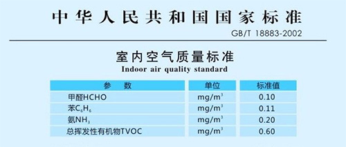 执行标准:室内空气质量检测执行国家标准GB/T 18883-2002《室内空气质量标准》,此标准为推荐性标准, 由国家质量监督检验检疫总局、卫生部和国家环保总局共同颁发。